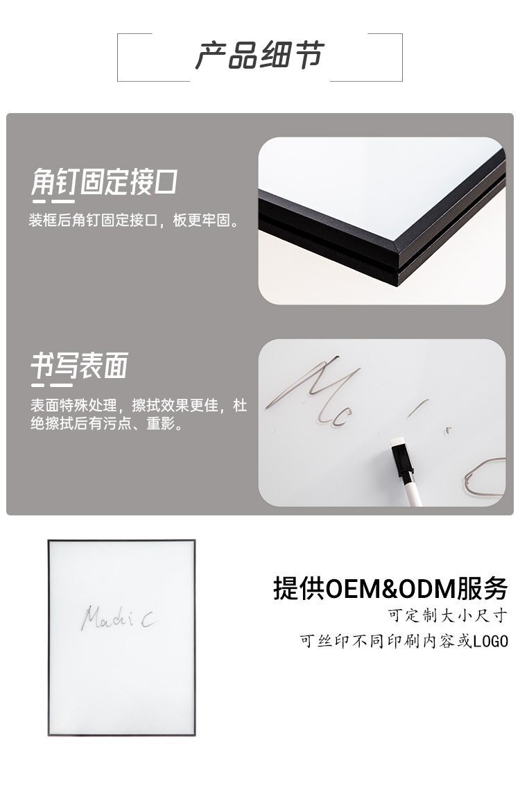 玻璃白板是一種高端辦公用品,具有鋁合金邊框和鋼化玻璃材質(zhì)。其磁吸面板設(shè)計(jì)能夠方便用戶固定文件和便簽,使辦公更加整潔高效。這款45x60厘米的玻璃白板不僅尺寸適中,而且可以根據(jù)客戶需求進(jìn)行定制,滿足不同辦公環(huán)境的需求。無(wú)論是用于會(huì)議討論、寫作記錄還是創(chuàng)意涂鴉,玻璃白板都能為用戶提供優(yōu)質(zhì)的書(shū)寫和展示體驗(yàn)。